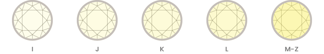 - G,H,I,J – These diamonds fall into a Near Colorless category. These diamonds will range from a barely perceivable warmer color in a diamond graded G, to a slightly warmer, more noticeable yellow body color in a diamond with a J color grade.